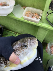 鶴見の新明丸さんにお世話になりました。わりと渋かったのですがなんとかショウサイフグ11匹など確保(ゲストにシロサバフグ2匹とイシモチ)。最大30