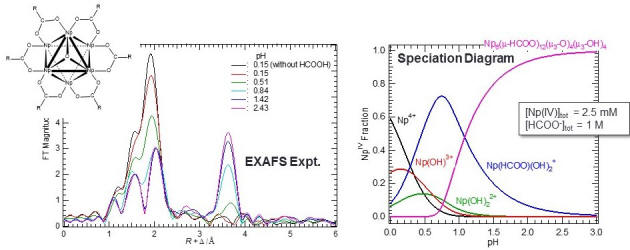 架橋グリシン及び3架橋オキソ/ヒドロキソ配位子から成るトリウム(IV)6核錯体(左)及びギ酸存在下における同様のNp(IV)6核錯体生成の様子(中: EXAFS動径構造関数のpH依存性, 右: 錯体分布図).